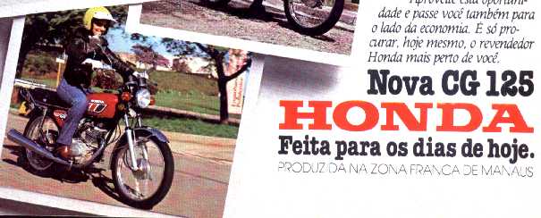 Comentarios: Amigo Ricardo:em relaçao a duvida do logotipo da CG 125.A honda na epoca mudava o grafismo dos modelos por volta de março. Me recordo de ,em fevereiro de 81 ter comprado uma Turuna zero km,com as faixas brancas e painel antigo e,um mes depois ser lançado o modelo novo com o "painel maracana"e as faixas na cor da moto. Portanto existiram os dois modelos da CG citada, dependendo do mes em que foi comprada.Caro Marcello: Agradecemos sua colaboração esclarecedora !