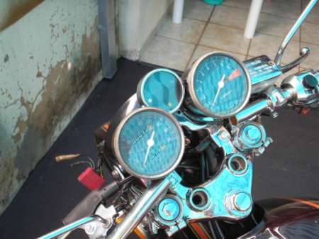 Levei o painel a uma empresa especializada.Teve que refazer os embuchamentos de ambos instrumentos.... ficou zero novamenteAs setas foram revisadas, e tive de trocar o relé de seta, que voltou a funcionar após trocar 2 lâmpadasE assim foram muitos outros detalhezinhos.. que se podemos dizer, se referiam a manutenção da moto em siCom a moto agora rodando e funcionando perfeitamente... passei aparte esteticaDesmontei inteira , mandei jatear o quadro e fazer pintura epoxi....O motor, conforme figuras, era prata de um lado, e prata metálico do outro, e foi pintado no quadro da moto..