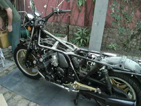 As ponteiras de escape já não eram as originais, o suporte da rabeta era um monte de ferro soldado, a pintura estava fora de padrão, o motor tinha sido muito mal pintado de preto e varias partes foram pintadas de dourado...e por ai vai ...