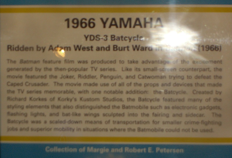 Nosso amigo, Alberto Apor, foi visitar o Museu Petersen, em Los Angeles e nos enviou algumas fotos. Separei uma para publicar, que achei interessante ... a Batmoto, usada no filme de cinema Batman, baseado na série de TV Batman dos anos 60. A moto foi criada especialmente para o filme, pois na série televisiva o veículo dos heróis era sómente o Batmóvel. A moto é uma Yamaha YDS3 de 1966, pilotada pelo Batman (Adam West) com side-car para o Robin (Burt Ward) ... legal, né ?!!